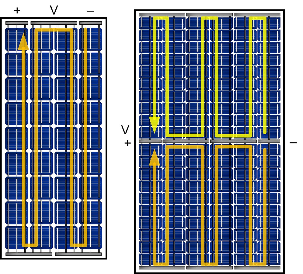 Left: common module layout. Right: half-cut cells module layout. Each module has three bypass diodes. On the left, they connect cell columns 1-2, 2-3 & 3-4. On the right, they connect cell columns 1-2, 3-4 & 5-6. Source: César Domínguez. CC BY-SA 4.0, Wikimedia Commons#