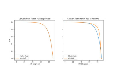 martin_ruiz calculates the incidence angle modifier (IAM) as described in [1]. The information required is the incident angle (AOI) and the angular losses coefficient (a_r). Note that [1] has a corrigendum [2] which clarifies a mix-up of ‘alpha’s and ‘a’s in the former.