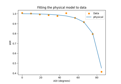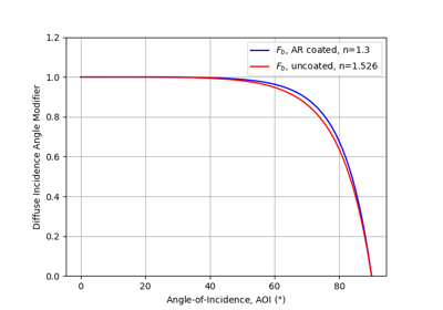 \[IAM = \frac{1 - \exp(-\frac{\cos(aoi)}{a_r})} {1 - \exp(\frac{-1}{a_r})}\]which is presented as \(AL(\alpha) = 1 - IAM\) in equation 4 of [1], with \(\alpha\) representing the angle of incidence AOI. Thus IAM = 1 at AOI = 0°, and IAM = 0 at AOI = 90°. This equation is only valid for 0° <= aoi <= 90°, therefore iam is constrained to 0.0 outside this interval.