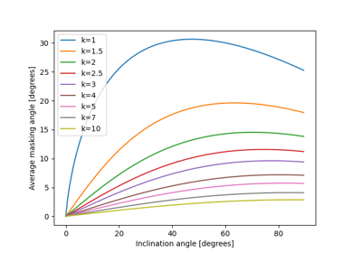 The masking angle is the angle from horizontal where the sky dome is blocked by the row in front. The masking angle is larger near the lower edge of a row than near the upper edge. This function calculates the average masking angle as described in [1].